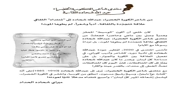 《من شاعر الكورة الخضراء عبدالله شحاده إلى “مُنتداه” الثقافي علاقة مُتجدِّدة بالثقافة، أدباً وشعراً، لم يطوِها الموت!》\ كَتَبَت الأديبة المهندسة ميراي شحاده الحداد