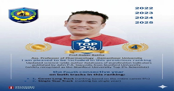 طبقا تصنيف جامعة ستانفورد يضع أستاذ الأدوية بجامعة دمنهور في مصاف العلماء الأكثر تأثيرًا عالميًا