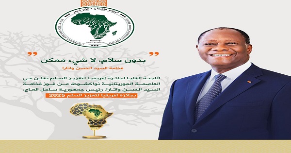 أعلن المؤتمر الإفريقي لتعزيز السلم في العاصمة الموريتانية نواكشوط عن فوز فخامة السيد الحسن واتارا، رئيس جمهورية ساحل العاج، “بجائزة إفريقيا لتعزيز السلم2025” وسيتم تسليم هذه الجائزة الدولية الهامة رسميًا خلال الجلسة الافتتاحية للملتقى الدولي الخامس للمؤتمر الإفريقي لتعزيز السلم، الذي سيعقد بالشراكة بين الحكومة الموريتانية ومنتدى أبوظبي للسلم في العاصمة نواكشوط أيام: 21 و22 و23 يناير 2025 تحت الرعاية السامية لفخامة رئيس الجمهورية السيد محمد ولد الشيخ الغزواني.